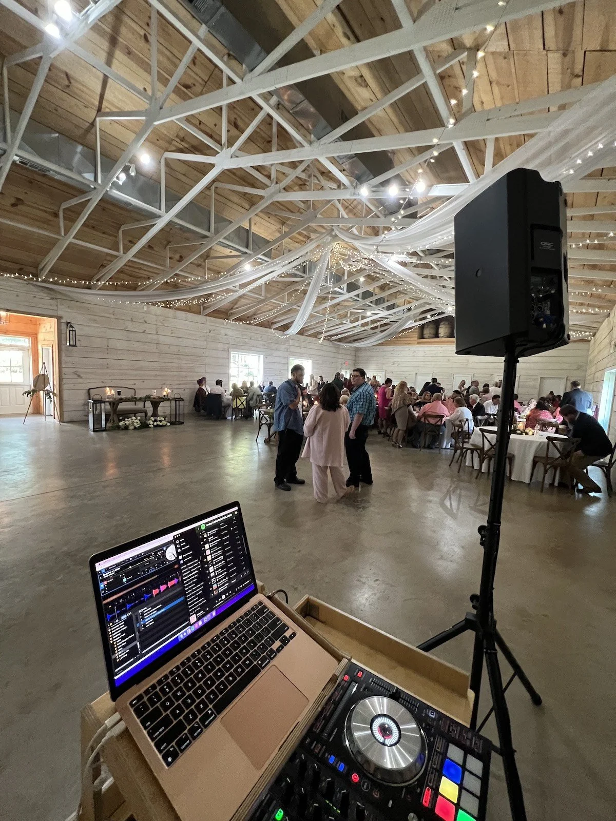 I use a minimal DJ setup at Koury Farms, with plenty of sound power to make the party jump. My custom wood DJ console complements the aesthetics in the barn. The emphasis is all on the music, not on the technology.
